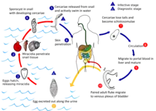 S. haematobium completes its life cycle in humans, as definitive hosts, and freshwater snails, as intermediate hosts, just like other schistosomes. But unlike other schistosomes that release eggs in the intestine, it releases its eggs in the urinary tract, which are excreted along with the urine.[15] In stagnant freshwater, the eggs hatch within 15 minutes into the larvae called miracidia. Each miracidium is either male or female.[25] Miracidia are covered with hair-like cilia with which actively swims searching for snails. Unless they infect a snail within 24–28 hours, they run out of energy (glycogen) reserves and die. Species of snail belonging to the genus Bulinus, including B. globosus, B. forskalii, B. nasutus, B. nyassanus, and B. truncatus, can harbour the miracidia.[26] The miracidia simply pierce through the soft skin of the snail and move to the liver. Inside the snail, their cilia is cast off and extra-epithelial covering forms within 24 hours. Then they transform into sporocysts and undergo active cell division after two weeks. The mother sporocyst produces many daughter sporocysts. Each daughter sporocyst forms new larvae called cercariae. One mother sporocyst produces half a million cercariae. After a month, the sporocysts rupture and cercariae are liberated. Free cercariae penetrate the liver and move out of the snail into water. Each cercaria has a biforked tail with which it swims to find a human host. Again the cercariae are short lived and can survive in water for 4–6 days unless they find a human host.[27]