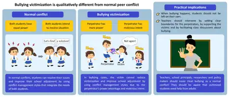 Bullying is a subcategory of aggressive behavior that is characterised by hostile intent (the harm caused is deliberate), imbalance of power (real or perceived power inequality between bully and victim), and repetition over a period of time.[20][21][22] More ordinary types of student-student conflicts, which are sometimes part of everyday school life, are not associated with an imbalance of power. In contrast to more ordinary conflicts, school bullying can severely harm victimized students.[5]