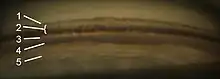 Gonioscopy of the anterior chamber angle. Labeled structures: 1. Schwalbe's line, 2. Trabecular meshwork (TM), 3. Scleral spur, 4. Ciliary body, 5. Iris