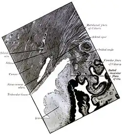 It is the origin of the longitudinal and circular fibres (which swerve acutely from the spur to run circumferentially, as a sphincter near the periphery of the lens)[1] of the ciliary muscle, and is attached posteriorly to the trabecular meshwork.