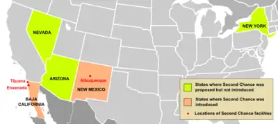 Between 1995 and 2009, Second Chance operated in prisons in Albuquerque, New Mexico, United States and in the Mexican cities of Tijuana and Ensenada. Its Mexican operations were closed down after it lost government funding. Its only U.S. operation was terminated in January 2009 by the mayor of Albuquerque. By that time it had received more than $1.5 million in public funding, but on closing it left debts of over $672,000 to the federal, state and city governments. Second Chance was proposed – but was rejected – for prisons in the states of Arizona, Nevada and New York.