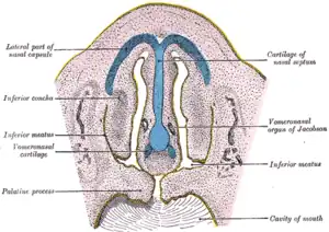 ![]() Frontal section of nasal cavities of a human embryo 28 mm. long (Kollmann) at about forty-four days. The two palatine processes can be seen here post-elevation in a horizontal position. The medial edges of the palatine processes are yet to fuse and form the roof of the oral cavity. | |