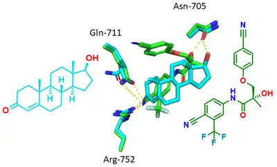 Overlay of the crystallographic structures of testosterone (cyan; PDB: 2AM9) with enobosarm (green; PDB: 3RLJ) complexed with AR. Hydrogen bonds between AR residues Arg-752, Gln-711, Asn-705 and the ligands are depicted as yellow dashes.