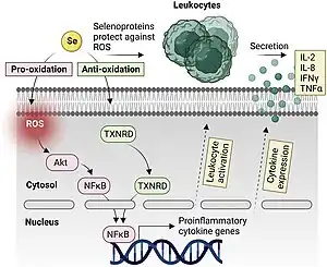 To date, many studies have been conducted on the benefits of selenium intake in reducing the risk of cancer incidence at the nutritional level, indicating that likely selenium functions as an immunostimulator, i.e. reversing the immunosuppression in tumour microenvironment towards antitumour immunity by activating immune cells (e.g. M1 macrophages and CD8+ T-lymphocytes, the elevated number of neutrophils and activated cytotoxic NK cells) and releasing pro-inflammatory cytokines such as IFNγ and TNFα.[39]