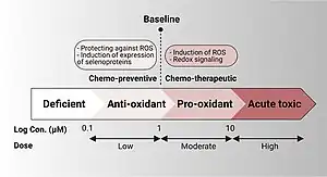 Selenium has bimodal biological action depending on the concentration. At low nutritional doses, selenium acts as an antioxidant through selenoproteins, scavenging ROS, supporting cell survival and growth; while, at supra-nutritional higher pharmacological doses, selenium acts as a pro-oxidant generating ROS and inducing cell death. In cancer, studies have been conducted mostly on the benefits of selenium intake in reducing the risk of cancer incidence at the nutritional level; however, fewer studies have explored the effects of supra-nutritional or pharmacological doses of selenium on cancer.[39]