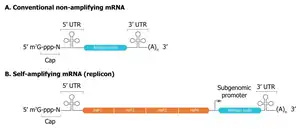Self-amplifying RNA (saRNA), also termed self-replicating RNA (srRNA), is a type of mRNA molecule engineered to replicate itself within host cells, enhancing protein expression and boosting the immune response, making it a promising tool for vaccines and other therapeutic applications. As a "next-generation" mRNA, saRNA is designed to achieve greater protein expression with a reduced dose compared to conventional mRNA.[1][2][3] Unlike conventional mRNA, which has a short half-life and limited ability to express proteins for an extended time, saRNA can sustain protein expression for longer periods. saRNA are based on positive single stranded RNA viruses most commonly alphaviruses such as Venezuelan equine encephalitis virus.
