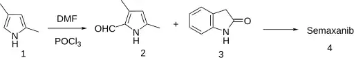 A Vilsmeier–Haack reaction on 2,4-dimethylpyrrole (1) gives the aldehyde (2). Knoevenagel condensation of this intermediate with oxindole (3) in the presence of base yields semaxanib.[9][10][11]