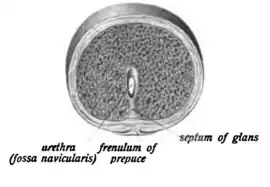 The septum glandis, also septum of the glans, refers to the fibrous partition of the ventral aspect of the glans penis that separates the two glans wings in the ventral midline.[1] The septum extends from the urethral meatus through the glanular urethra (fossa navicularis) and ends in the tunica albuginea of the human penis. Externally it is attached to the frenulum which extends lower on the neck of the penis.[2]