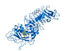 ![]() Crystal structure of serralysin with co-ordinated zinc (grey) and calcium (white). Rendered from PDB 1SAT. | |||||||||