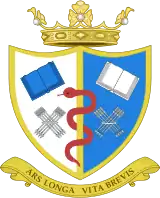 The coat of arms of the Sheffield Faculty of Medicine was granted by the College of Arms on 12 December 2003.[1] It features elements from the coat of arms of the University of Sheffield: the Crown of Success, two sheaves of arrows and the open books, as well as the azure background colour. The rod of Asclepius is centred on the shield.[55] It can be seen throughout the Medical School on its buildings. A variation of the crest is used by various Sheffield Medical Society sports teams.[56]