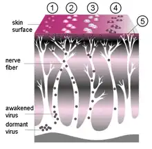 Unless the immune system is compromised, it suppresses reactivation of the virus and prevents shingles outbreaks. Why this suppression sometimes fails is poorly understood,[44] but shingles is more likely to occur in people whose immune systems are impaired due to aging, immunosuppressive therapy, psychological stress, or other factors.[45][46] Upon reactivation, the virus replicates in neuronal cell bodies, and virions are shed from the cells and carried down the axons to the area of skin innervated by that ganglion. In the skin, the virus causes local inflammation and blistering. The short- and long-term pain caused by shingles outbreaks originates from inflammation of affected nerves due to the widespread growth of the virus in those areas.[47]