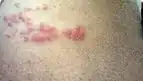 Shingles can be confused with herpes simplex, dermatitis herpetiformis and impetigo, and skin reactions caused by contact dermatitis, candidiasis, certain drugs and insect bites.[55]
