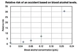 Research shows an exponential increase of the relative risk for a crash with a linear increase of BAC.[10] NHTSA reports that the following blood alcohol levels (BAC) in a driver will have the following predictable effects on his or her ability to drive safely: (1) A BAC of .02 will result in a "[d]ecline in visual functions (rapid tracking of a moving target), a decline in the ability to perform two tasks at the same time (divided attention)"; (2) A BAC of .05 will result in "[r]educed coordination, reduced ability to track moving objects, difficulty steering, reduced response to emergency driving situations"; (3) A BAC of .08 will result in "[c]oncentration, short-term memory loss, speed control, reduced information processing capability (e.g., signal detection, visual search), impaired perception"; (4) A BAC of .10 will result in "[r]educed ability to maintain lane position and brake appropriately"; and (5) A BAC of .15 will result in "[s]ubstantial impairment in vehicle control, attention to driving task, and in necessary visual and auditory information processing."[11]