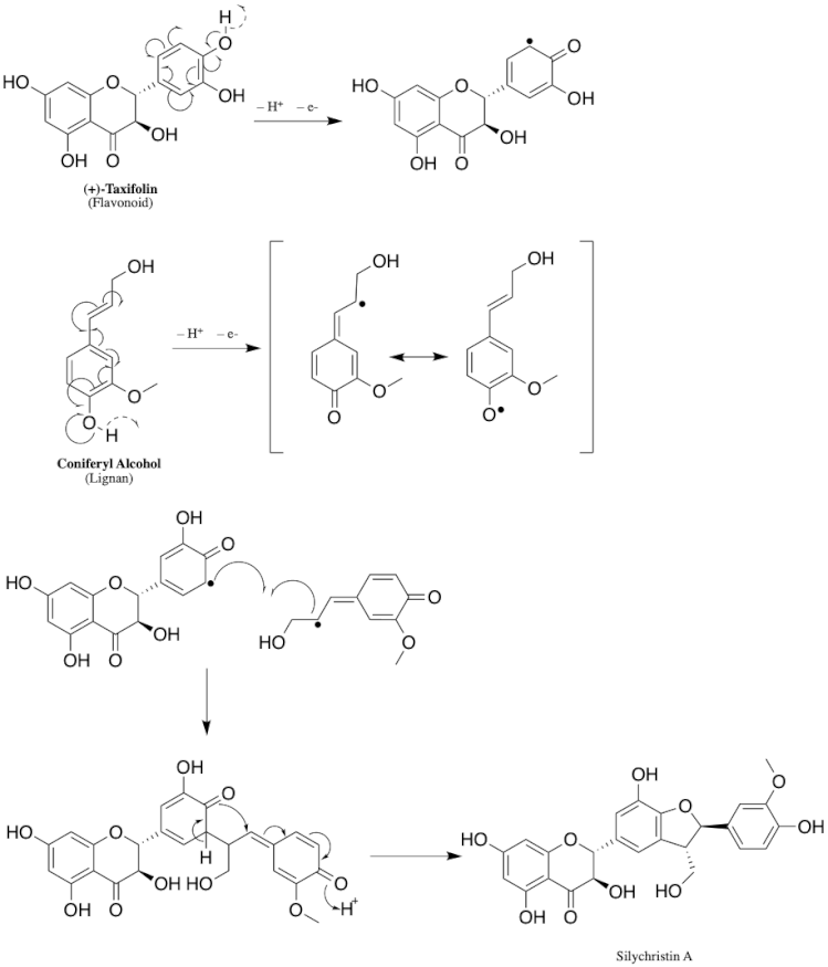 Still much is not known today about the specific enzymes and mechanism of the biosynthesis of silychristin and its related flavononlignan counterparts in S. marianum. The most widely accepted hypothesis for the biosynthesis of flavonolignans is via an oxidative radicalization of both the flavonoid precursor and coniferyl alcohol, followed by coupling of the two radicals, and then proton transfer(s) in order to aromatize the intermediate to get the final product. Although the enzyme catalyzing this oxidative coupling of flavonolignans has not yet been fully characterized, peroxidase enzymes have been hypothesized as likely candidates because they are radical generators.[9]