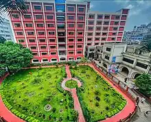 The campus is located at Mitford road, Babubazar, Old Dhaka, a historic old part of the Dhaka city.[12] It is spread over about 2.8 acres of land, on the bank of Buriganga river.[13] The medical college building is situated to the south-east of the hospital area, near the river bank with a large garden in front.[14] The building is four-storeyed with a floor space of 4,940 square meters on each floor. The building accommodates the Departments of Anatomy, Pathology, Biochemistry, and Microbiology. The Departments of Physiology, Pharmacology, Community Medicine, and Forensic Medicine are housed in another building in front of the main building.[7]