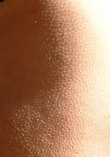 When experiencing cold conditions, bumps develop around hair follicles (also known as goosebumps or goose pimples).[16] These bumps serve to facilitate the pilo-erection of hairs or "standing on end", essentially perpendicular to the skin surface. The mechanism has provided an evolutionary advantage to fur-bearing animals in insulation of skin temperature, but it is not so helpful in humans who typically have sparse hair coverage over the majority of their skin. The mechanism provides little insulation and thus plays an insignificant role in thermoregulatory processes in homo sapiens.[16]