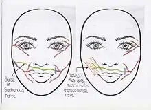Smile surgery or smile reconstruction is a surgical procedure that restores the smile for people with facial nerve paralysis. Facial nerve paralysis is a relatively common condition with a yearly incidence of 0.25% leading to function loss of the mimic muscles.[1] The facial nerve gives off several branches in the face. If one or more facial nerve branches are paralysed, the corresponding mimetic muscles lose their ability to contract.[2] This may lead to several symptoms such as incomplete eye closure with or without exposure keratitis, oral incompetence, poor articulation, dental caries, drooling, and a low self-esteem.[3][4] This is because the different branches innervate the frontalis muscle, orbicularis oculi and oris muscles, lip elevators and depressors, and the platysma. The elevators of the upper lip and corner of the mouth are innervated by the zygomatic and buccal branches.[5] When these branches are paralysed, there is an inability to create a symmetric smile.[3]