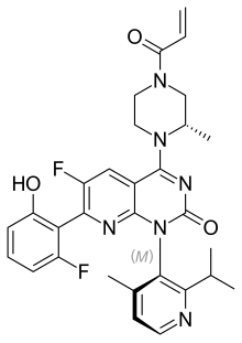 Sotorasib, sold under the brand names Lumakras and Lumykras, is an anti-cancer medication used to treat non-small-cell lung cancer.[4][5] It targets a specific mutation, G12C, in the protein K-Ras encoded by gene KRAS which is responsible for various forms of cancer.[7][8] Sotorasib is an inhibitor of the RAS GTPase family.[4]