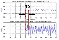 - Interaural time difference (ITD) – Sound from the right side reaches the right ear earlier than the left ear. The auditory system evaluates interaural time differences from: (a) Phase delays at low frequencies and (b) group delays at high frequencies.