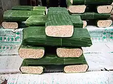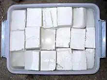 | Blocks of tofu, prepared by coagulating soy milk and then pressing to remove excess water | |