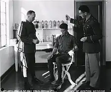 While testing an early turn and slip indicator devised by his friend Elmer Sperry in 1918, United States Army Air Corps pilot William Ocker entered a graveyard spiral while flying through clouds without visual references; the turn indicator showed he was in a turn, but his senses told him he was in level flight. Emerging from the clouds, Ocker was able to recover from the dive.[2] In 1926, Ocker was subjected to a Bárány chair equilibrium test by Dr. David A. Myers at Crissy Field; the resulting duplication of the somatogyral illusion he had experienced and a subsequent re-test, which he passed using the turn indicator,[3] led him to develop and champion instrumented flight.[4] Sperry would go on to invent the gyrocompass and attitude indicator, both of which were being tested by 1930.[5]: 8 With Lt. Carl Crane, Ocker published the instructional text Blind Flying in Theory and Practice in 1932.[4] Influential advocates of instrumented flight training included Albert Hegenberger and Jimmy Doolittle.[5]: 8