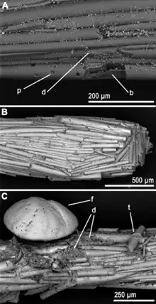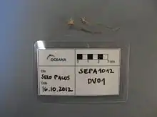 At (4 to 5 centimetres (1.6 to 2.0 in)) long, Spiculosiphon oceana is the largest foraminifera found in the Mediterranean. The species creates a test (shell) made out of sponge spicules, "gluing" them together with a protein it secretes, much like sponges do.[1] The spicules it uses are carefully selected and laid parallel to the main stalk of the creature.[2] Because of its large size and its appearance, S. oceana was originally mistaken as a multi-cellular animal from the sponge family.[1]