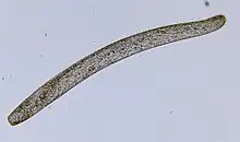 Spirostomum is a medium to large worm-like (vermiform) elongated ciliate, ranging from around 150 μm to 4 mm and is large enough to be confused with small helminths. It moves by gliding slowly over or swimming freely above the substrate. It possesses tubular or somewhat flattened bodies, with colours ranging from a faint brown or yellow, to green. The organism is bound externally by a thin layer of ectoplasm while the endoplasm consists of large vacuoles separated by a mesh of fluid protoplasm. Cells are often hosts of prokaryotic and eukaryotic symbionts.[5][6][1]