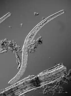 Spirostomum is a genus of ciliated protists in the class Heterotrichea. It is known for being very contractile.[5] Having been first identified by Christian Gottfried Ehrenberg in 1834, further research has identified eight additional true morphospecies.[6][7][1] This bacterivore genus mainly lives in the sediment deposits at the bottom of various aquatic habitats, and members possess rquA genes that could be responsible for their ability to survive in these hypoxic and anoxic environments.[2][3][4][8] They are identifiable by their relatively (to other ciliates) large tubular/flat vermiform bodies.[5][6][1] Their life cycle consists of a growth stage, in which they mature, and asexual and sexual reproduction stages.[6] Some species are model organisms for studies on human pathogenic bacteria, while others are sensitive and accurate bioindicators for toxic substances.[2]