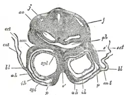 ![]() Transverse section through the region of the heart in a rabbit embryo of nine days. X 80. (Kölliker.) j, j. Jugular veins. ao. Aorta. ph. Pharynx. som. Somatopleure. bl. Proamnion. ect. Ectoderm. ent. Entoderm. p. Pericardium. spl. Splanchnopleure. ah. Outer wall of heart. ih. Endothelial lining of heart. é. Septum between heart tubes. | |