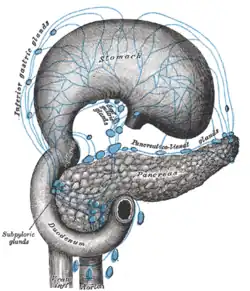 ![]() Lymphatics of stomach, etc. The stomach has been turned upward. | |