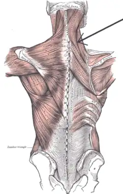 ![]() Muscles connecting the upper extremity to the vertebral column. (Splenius capitis et cervicis labeled at upper right, at neck.) | |