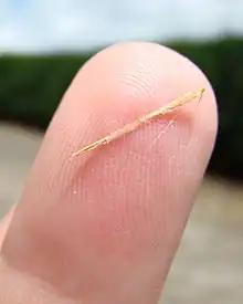 A splinter (also known as a sliver) is a fragment of a larger object, or a foreign body that penetrates or is purposely injected into a body. The foreign body must be lodged inside tissue to be considered a splinter. Splinters may cause initial pain through ripping of flesh and muscle, or infection through bacteria on the foreign object.[1]