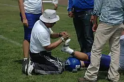 Sports injuries are injuries that occur during sports or exercise in general. In the United States, approximately 30 million people participate in some form of organized sports.[1] Of those 30 million, about 3 million athletes aged 14 and under suffer a sports related injury annually. [1] According to a study performed at Stanford University, 21% of injuries observed in elite college athletes caused them to miss at least one day of sports activity, and approximately 77% of these injuries involved the knee, leg, ankle, or foot.[1] The leading cause of death from sports injuries is traumatic head or neck injuries.[2]