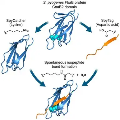The SpyTag/SpyCatcher system is a technology for irreversible conjugation of recombinant proteins. The peptide SpyTag (13 amino acids) spontaneously reacts with the protein SpyCatcher (12.3 kDa) to form an intermolecular isopeptide bond between the pair.[1] DNA sequence encoding either SpyTag or SpyCatcher can be recombinantly introduced into the DNA sequence encoding a protein of interest, forming a fusion protein. These fusion proteins can be covalently linked when mixed in a reaction through the SpyTag/SpyCatcher system.