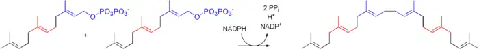 Squalene is biosynthesised by coupling two molecules of farnesyl pyrophosphate. The condensation requires NADPH and the enzyme squalene synthase.