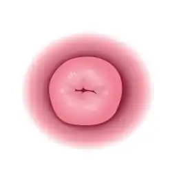 The ectocervix (also known as the vaginal portion of the cervix) has a convex, elliptical shape and projects into the cervix between the anterior and posterior vaginal fornices. On the rounded part of the ectocervix is a small, depressed external opening, connecting the cervix with the vagina. The size and shape of the ectocervix and the external opening (external os) can vary according to age, hormonal state, and whether childbirth has taken place. In women who have not had a vaginal delivery, the external opening is small and circular, and in women who have had a vaginal delivery, it is slit-like.[8] On average, the ectocervix is 3 cm (1.2 in) long and 2.5 cm (1 in) wide.[3]
