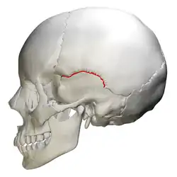 ![]() Side view of the cranium. Squamosal suture highlighted. | |