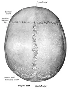 The external surface is convex and usually exhibits, in the lower part of the middle line, the remains of the frontal suture; in infancy this suture divides the frontal bone into two and later fuses. A condition where fusion has not taken place, may persist throughout life and is referred to as a metopic suture.