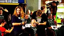 All events are hosted by volunteers in the community, with the foundation providing planning tools and support.[6] Volunteers can find events near them and help set up the event space, shave heads, have their heads shaved, or any combination of the three. Events have taken place in all 50 US states and 31 countries. Since 2000, St. Baldricks event organizers and volunteers have hosted nearly 4,200 head-shaving events and shaved over 190,500 heads, raising over $118 million for life-saving childhood cancer research.[2] After a volunteer reaches a certain number of repeat years, the foundation awards them through "knighting ceremonies". According to Plenty Consulting, 2,600 volunteers had thus far earned the Knight of the Bald Table award in 2015, which is given for seven years of service to the organization.[7] Charity Navigator gave the foundation a 94 out of a possible 100 score rating (2024) and 4 Stars in Financial Score out of a possible 4 Star rating.[8] According to Better Business Bureau, the non-profit meets the 20 Standards for Charity Accountability.[9]