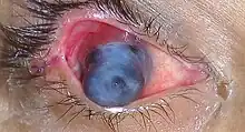 A staphyloma is an abnormal protrusion of the uveal tissue through a weak point in the eyeball.[1][2] The protrusion is generally black in colour, due to the inner layers of the eye. It occurs due to weakening of outer layer of eye (cornea or sclera) by an inflammatory or degenerative condition. It may be of five types, depending on the location on the eyeball (bulbus oculi).