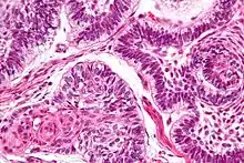 ![]() The cervical loop area: (1) dental follicle cells, (2) dental mesenchyme, (3) odontoblasts, (4) dentin, (5) stellate reticulum, (6) outer enamel epithelium, (7) inner enamel epithelium, (8) ameloblasts, (9) enamel. | |