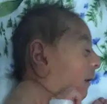 Physical features are variable but usually include short stature, large, low-set ears, a high nasal bridge, a small jaw and a large mouth.[2][6][10] Some of those affected have had epicanthal folds or fine, sparse hair.[5] One individual was reported to have been born with a skin tag on the left cheek.[2][10] Four affected individuals who did not survive to term had cleft palate.[2][6]