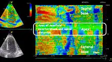 Strain rate imaging is a method in echocardiography (medical ultrasound) for measuring regional or global deformation of the myocardium (heart muscle). The term "deformation" refers to the myocardium changing shape and dimensions during the cardiac cycle. If there is myocardial ischemia, or there has been a myocardial infarction, in part of the heart muscle, this part is weakened and shows reduced and altered systolic function. Also in regional asynchrony, as in bundle branch block, there is regional heterogeneity of systolic function. By strain rate imaging, the simultaneous function of different regions can be displayed and measured. The method was first based on colour tissue Doppler.[1] by using the longitudinal myocardial velocity gradient, already in use transmurally.[2] Later, the regional deformation has also been available by speckle tracking echocardiography,[3][4] both methods having some, but different methodological weaknesses. Both methods, however, will acquire the same data (measurements may differ somewhat, however, being method dependent), and also can be displayed by the same type of display.