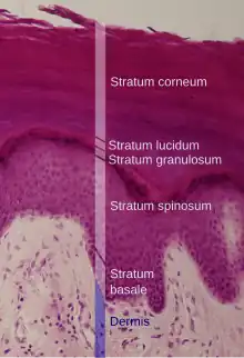 Located between the stratum granulosum and stratum corneum layers, it is composed of three to five layers of dead, flattened keratinocytes.[3][4] The keratinocytes of the stratum lucidum do not feature distinct boundaries and are filled with eleidin, an intermediate form of keratin. They are surrounded by an oily substance that is the result of the exocytosis of lamellar bodies accumulated while the keratinocytes are moving through the stratum spinosum and stratum granulosum.