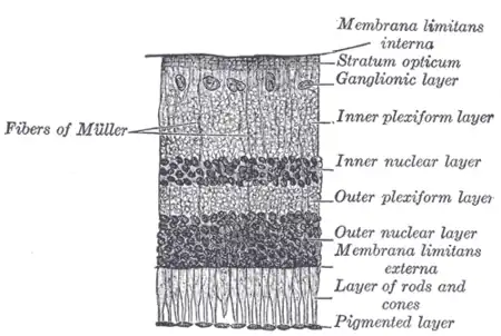 ![]() Section of retina. (Stratum opticum labeled at right, second from the top.) | |