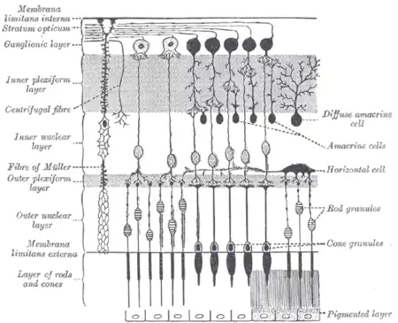 ![]() Plan of retinal neurons. (Stratum opticum labeled at left, second from the top.) | |
