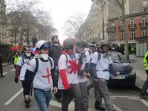 Street medics, or action medics, are volunteers with a minimum of first aid medical training supplemented by specific protest-related training, who attend protests and demonstrations as support or mutual aid roles to provide medical and wellness care. Unlike emergency medical technicians (EMTs) or paramedics, who have undergone education for professional medical care, street medics usually operate under Good Samaritan clauses and use methods learned through specific protest-medicine training programs which individuals are required to undertake in order to be recognized as a trained street medic.[1]