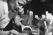 Bugie was pursuing a master's degree in Waksman's lab at Rutgers University at this time. Prior to this, she received her bachelor's degree in microbiology at New Jersey College for Women.[28] Although Bugie was considered to be the second author on the Proceedings of the Society for Experimental Biology paper, she was not listed on the patent submission.[28] Bugie's contributions to Waksman's lab were great. In addition to her work on streptomycin, she also helped develop other antimicrobial substances,[30] had two peer-reviewed publications,[31][32] and researched the use of antimicrobials against plant pathogens,[33] among several other important contributions to the scientific field, particularly in regard to microbiology.