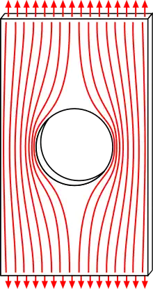 The degree of concentration of a discontinuity under typically tensile loads can be expressed as a non-dimensional stress concentration factor , which is the ratio of the highest stress to the nominal far field stress. For a circular hole in an infinite plate, .[1] The stress concentration factor should not be confused with the stress intensity factor, which is used to define the effect of a crack on the stresses in the region around a crack tip.[2]