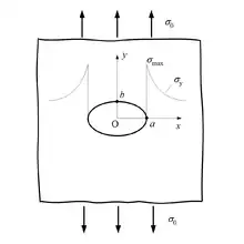 E. Kirsch derived the equations for the elastic stress distribution around a hole. The maximum stress felt near a hole or notch occurs in the area of lowest radius of curvature. In an elliptical hole of length and width , under a far-field stress , the stress at the ends of the major axes is given by Inglis' equation:[5]